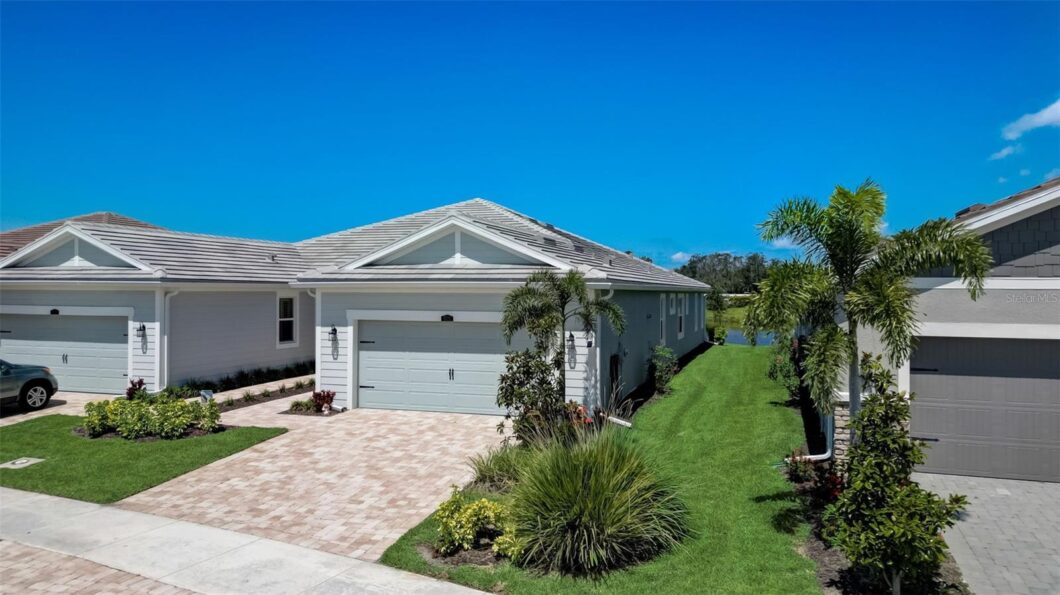DAZZLING SUNSET VIEWS FROM THIS SUNRISE PRESERVE WATERFRONT VILLA AT PALMER RANCH – Built in 2021 by Mattamy Homes, this 2 BEDROOM 2 BATH +DEN & 2 CAR GARAGE VILLA is MOVE-IN READY RIGHT HERE, RIGHT NOW – NO NEED TO WAIT FOR NEW CONSTRUCTION! Mattamy’s Seascape floor plan is the largest of the villa floor plans in Sunrise Preserve and is highly coveted, yet rarely available – don’t miss this opportunity. Situated on one of the many ponds and lakes in Sunrise Preserve with FULL WATERFRONT VIEWS, you can enjoy your morning coffee on the lanai overlooking the water or take in a gorgeous sunset in the evening! Great curb appeal with a coastal vibe is just what you’d hope to see in a Florida home! The sweet entryway is cheerful and welcoming! Please note the glass storm door sellers have installed which streams in natural light. Upon entry into the foyer, you’ll find a comfortable flex room currently being used as a den. Continue to the main living area – an OPEN CONCEPT space – including the kitchen, dining room and living room. The gourmet kitchen with a walk-in pantry features an expansive island with granite countertops and is excellent for entertaining. Stainless appliances include the side-by-side refrigerator, dishwasher, double sink, microwave oven and gas range. Timeless Shaker-style 42” cabinets in rich warm tones and a beautiful tile backsplash complete the design. The split floor plan offers you and your guests privacy with the 2nd bedroom and guest bathroom at the front of the house while the master suite is at the back of the home. The warm, neutral themed finishes are carried out with 17” square ceramic tile flooring in the main living areas and carpeting in the bedrooms and den. Your master suite overlooks the water and with three windows is light and bright! The ensuite master bathroom has a dual sink vanity, a spacious walk-in shower with built-in bench seat and a very generous master closet. Three large sliding glass doors take you from the living room out to the screened lanai with brick pavers, beautiful water views and remote controlled solar shades offering additional privacy. Sellers are including the washer & dryer along with all the other appliances including the tankless gas water heater. Sunrise Preserve is an amenity-rich community offering resort-style living at its best! With a full-time activities director you won’t run out of things to do – whether it be playing tennis, pickleball, bocce ball or enjoying the state of the art clubhouse featuring a gathering room, exercise room, and an amazing resort style pool area. This beautiful Palmer Ranch community is conveniently located to the beautiful white sandy Gulf beaches, shopping, dining, golfing, the Legacy Trail and has easy access to I75. DON’T WAIT – SCHEDULE A SHOWING TODAY!!!